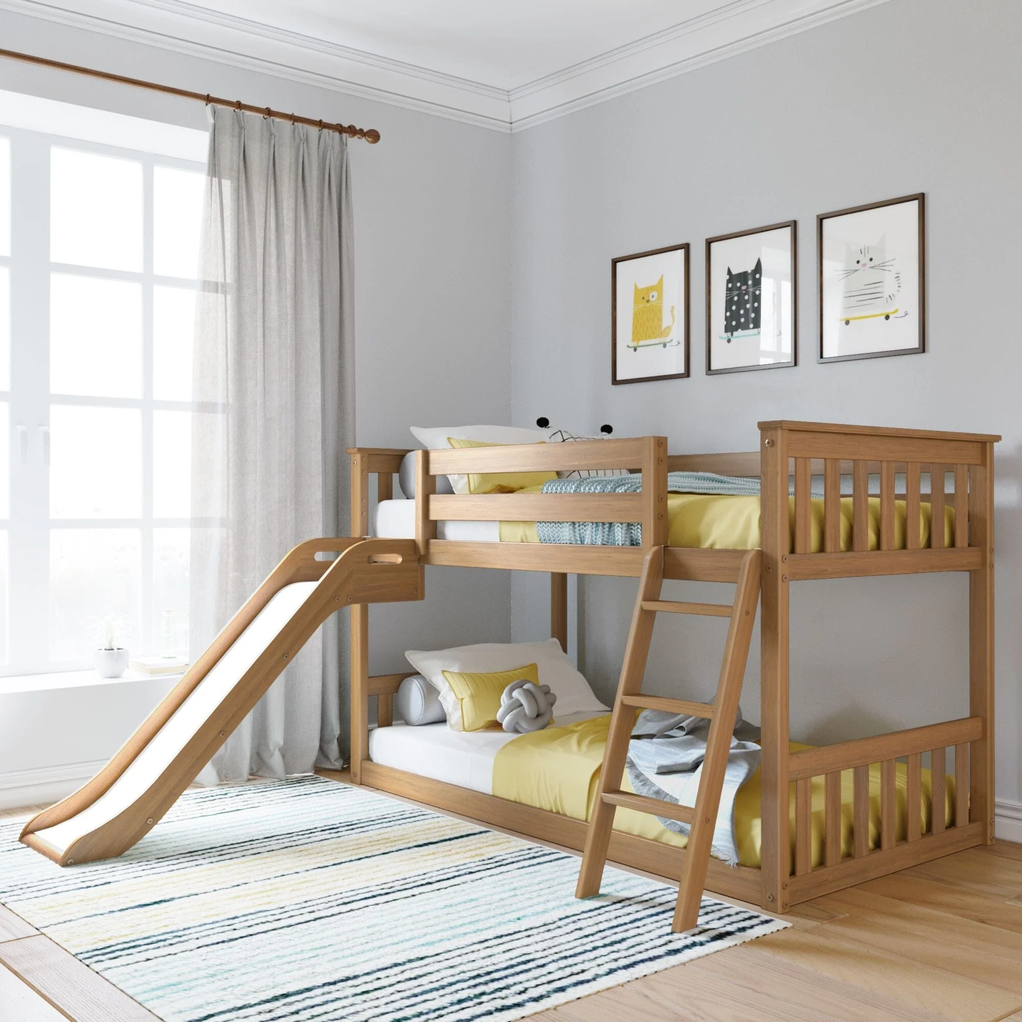 Discover the ultimate bunk bed for sleep and play! Our Twin over Twin Low Bunk Bed with Easy Slide has a stacked design that comfortably sleeps two while opening up space in your room for play. The new Easy Slide has a lowered top platform to center and stabilize kids before sliding starts for a smooth ride and a softer landing. Thoughtfully designed for safety and comfort, the Easy Slide makes playtime extra fun and safe.