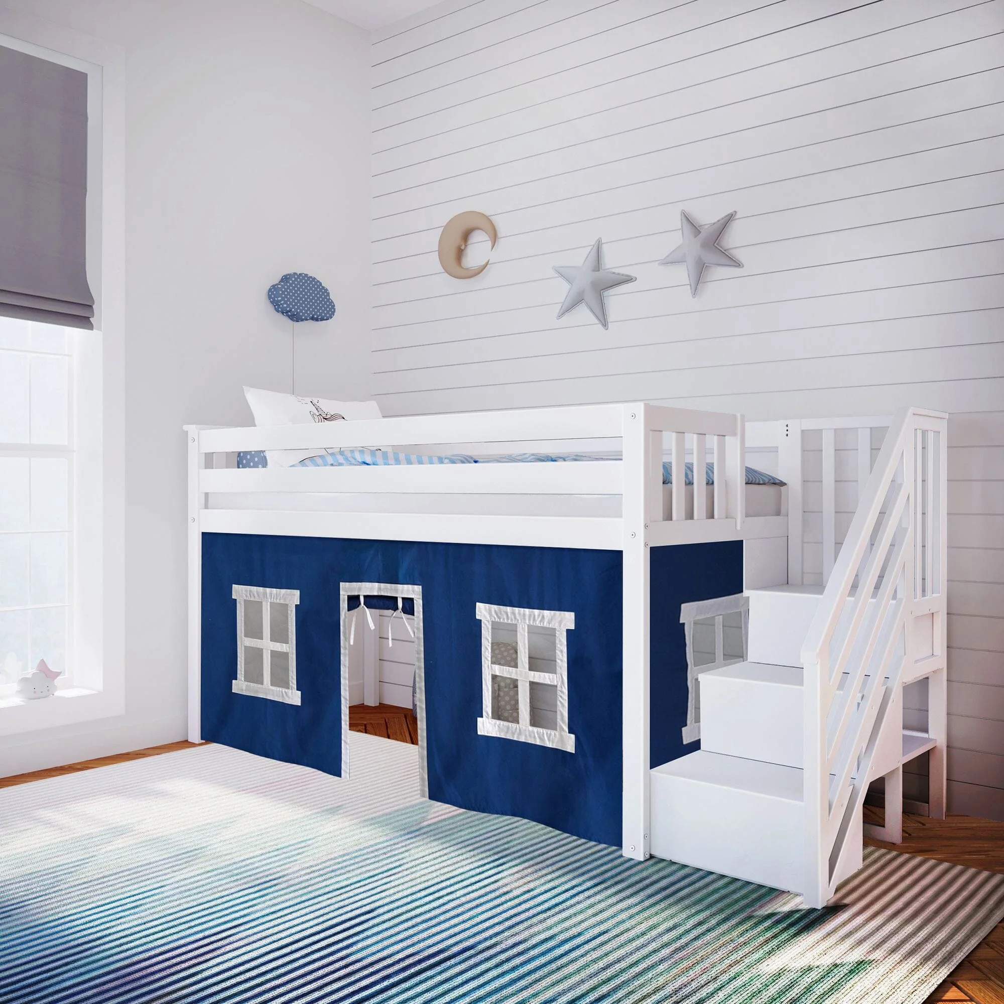 Adorable play curtains turn up the fun factor on our favorite low loft with stairs! Only 50" high this space-saving style is great for smaller rooms & low ceilings. Staircase with bannister design ensures extra safe & comfortable climbing.